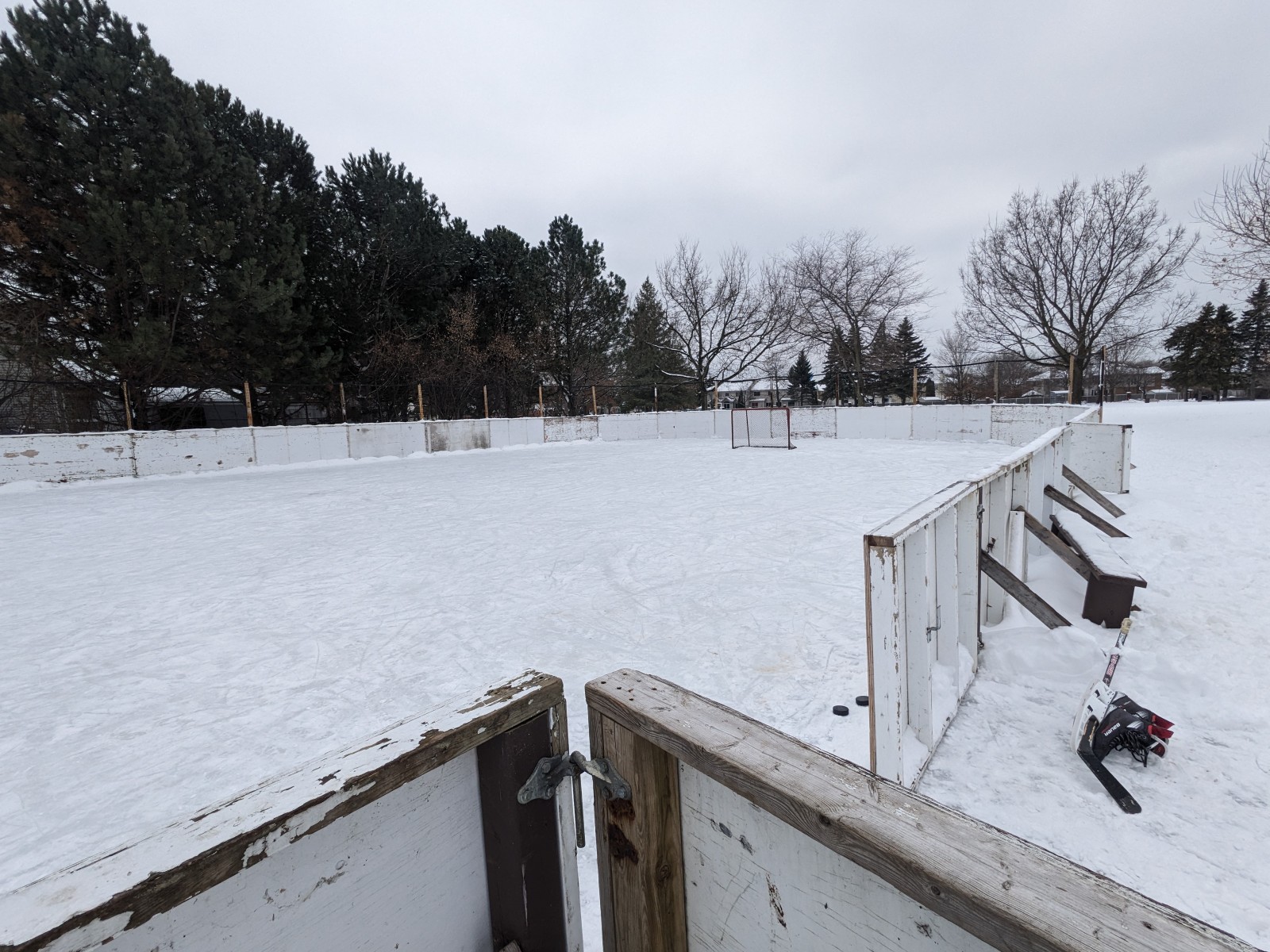 Rough/bumpy in corners. Ice generally good. Recently shoveled Snow along boards.